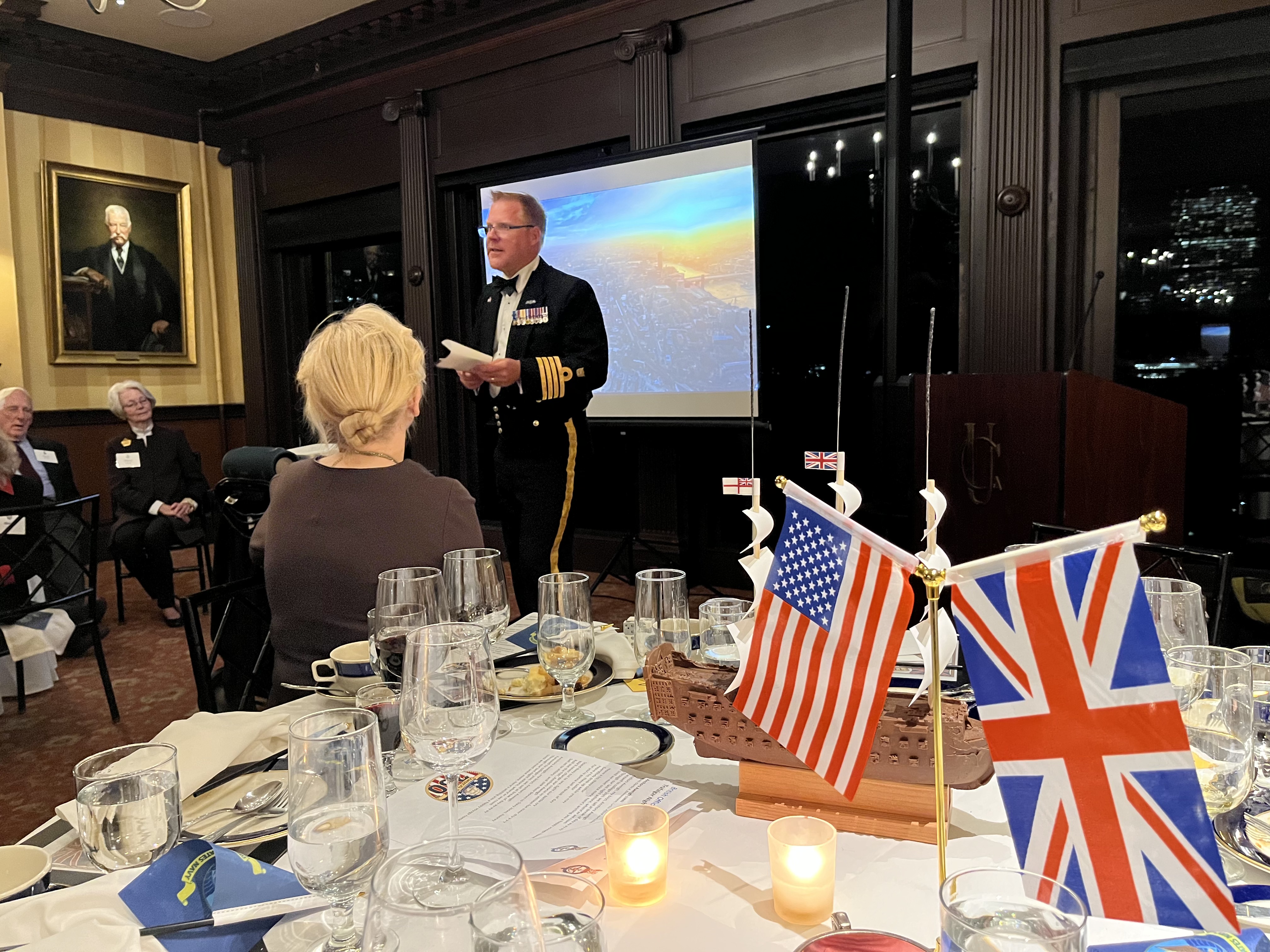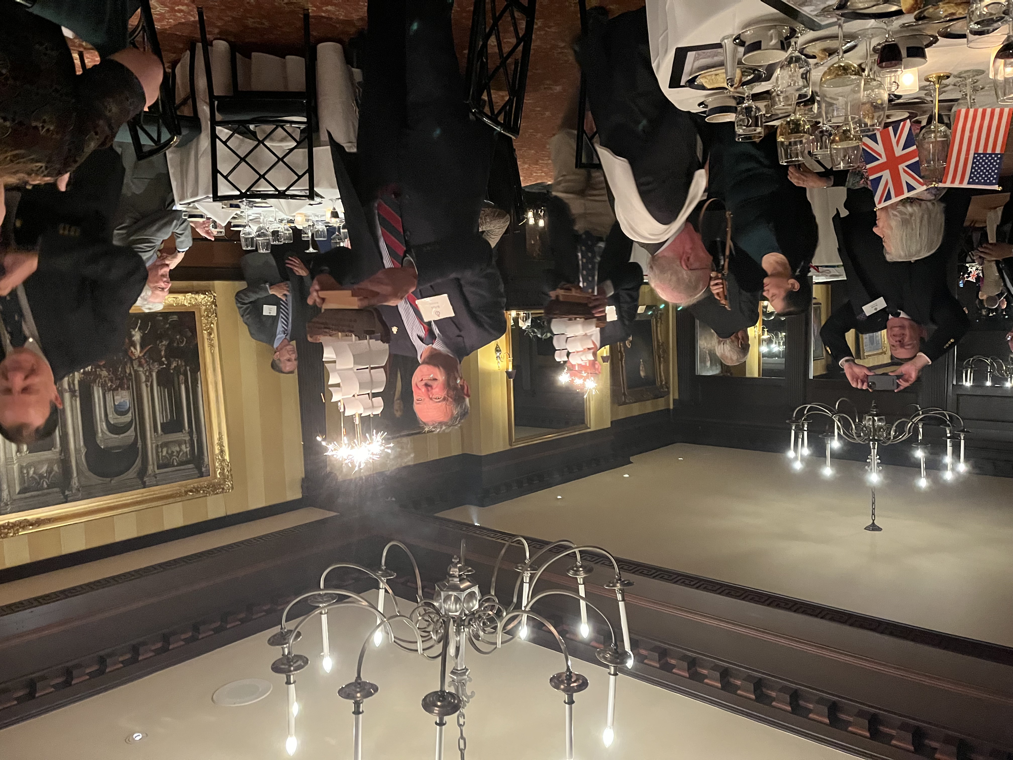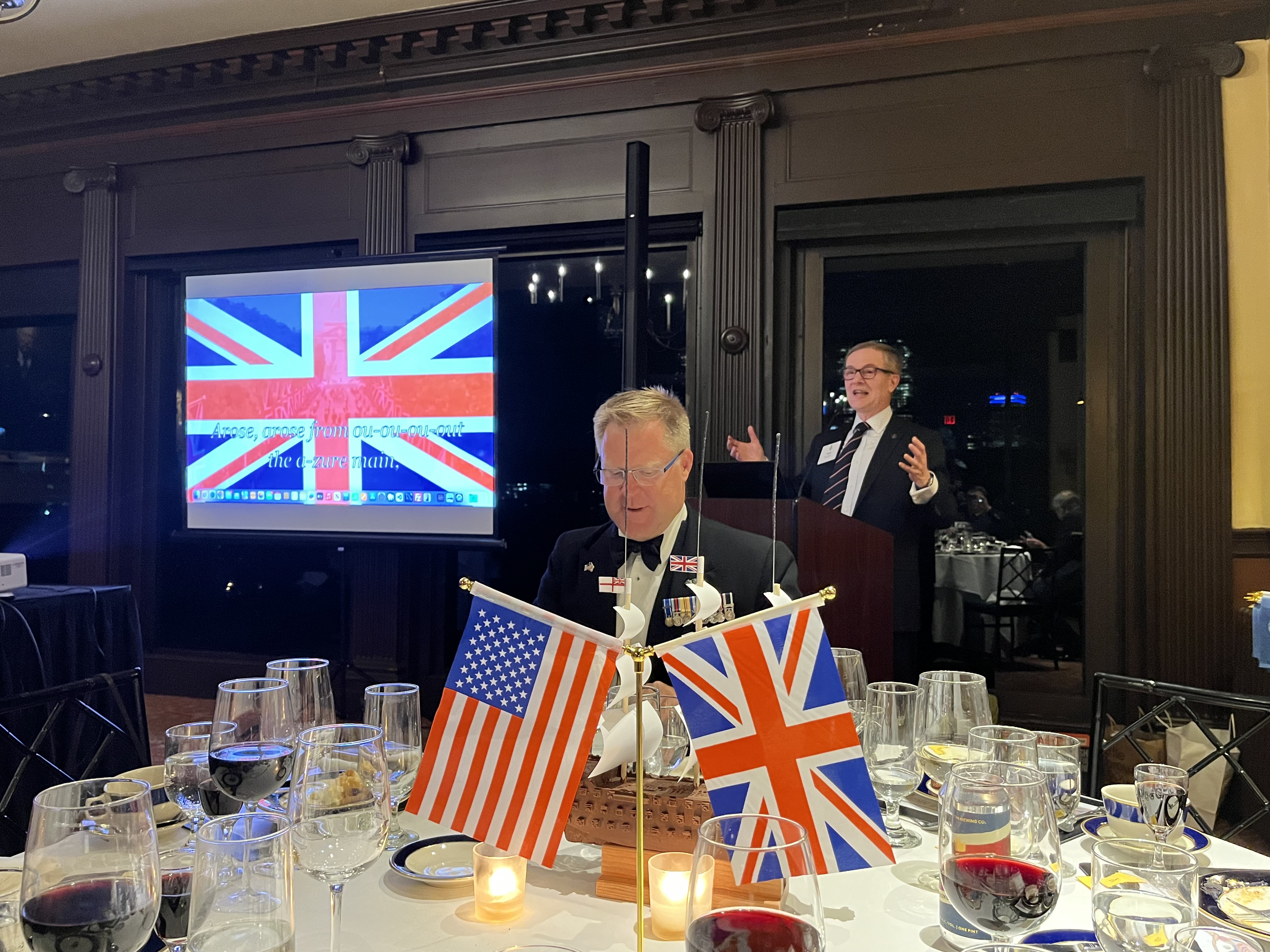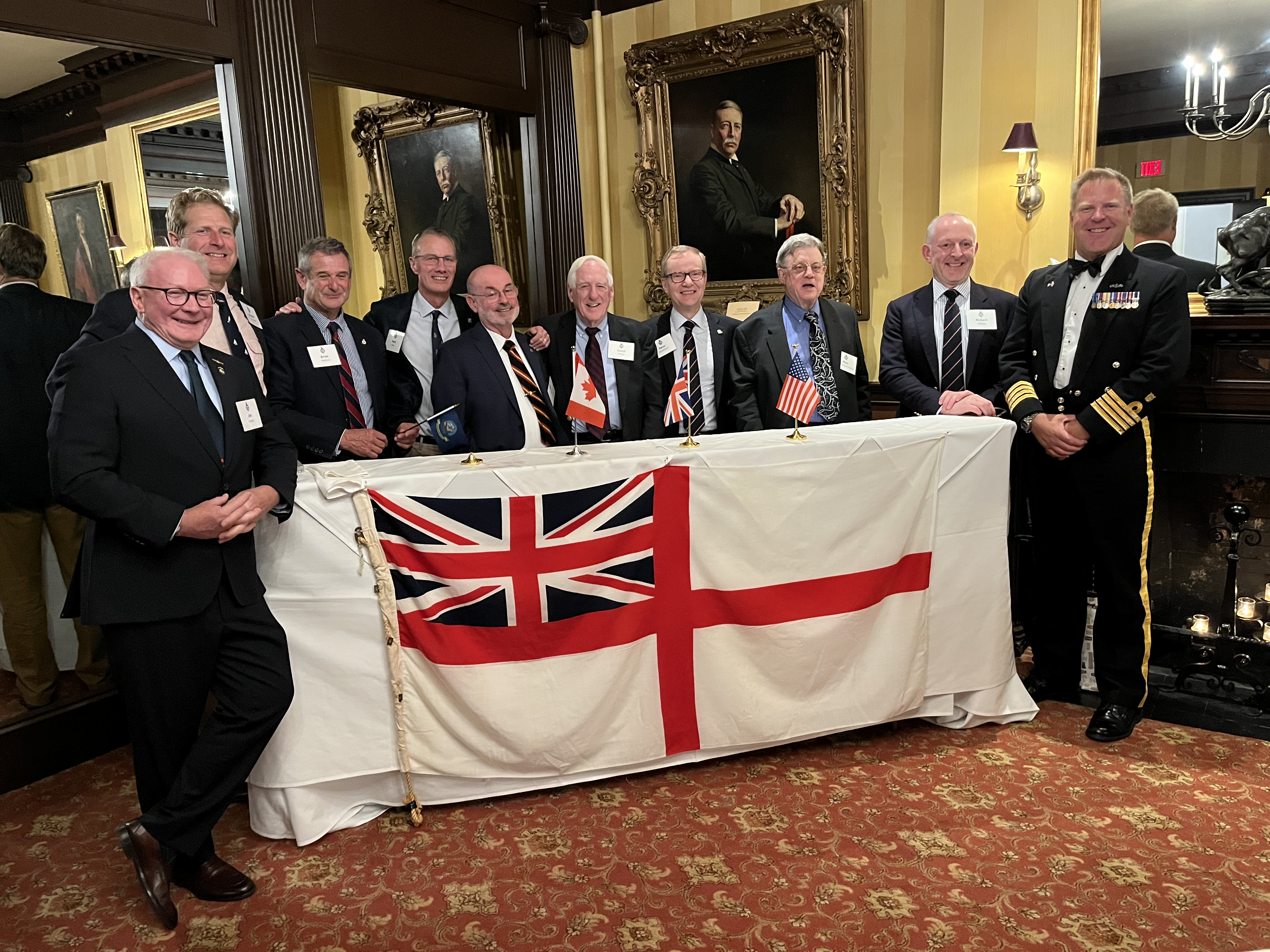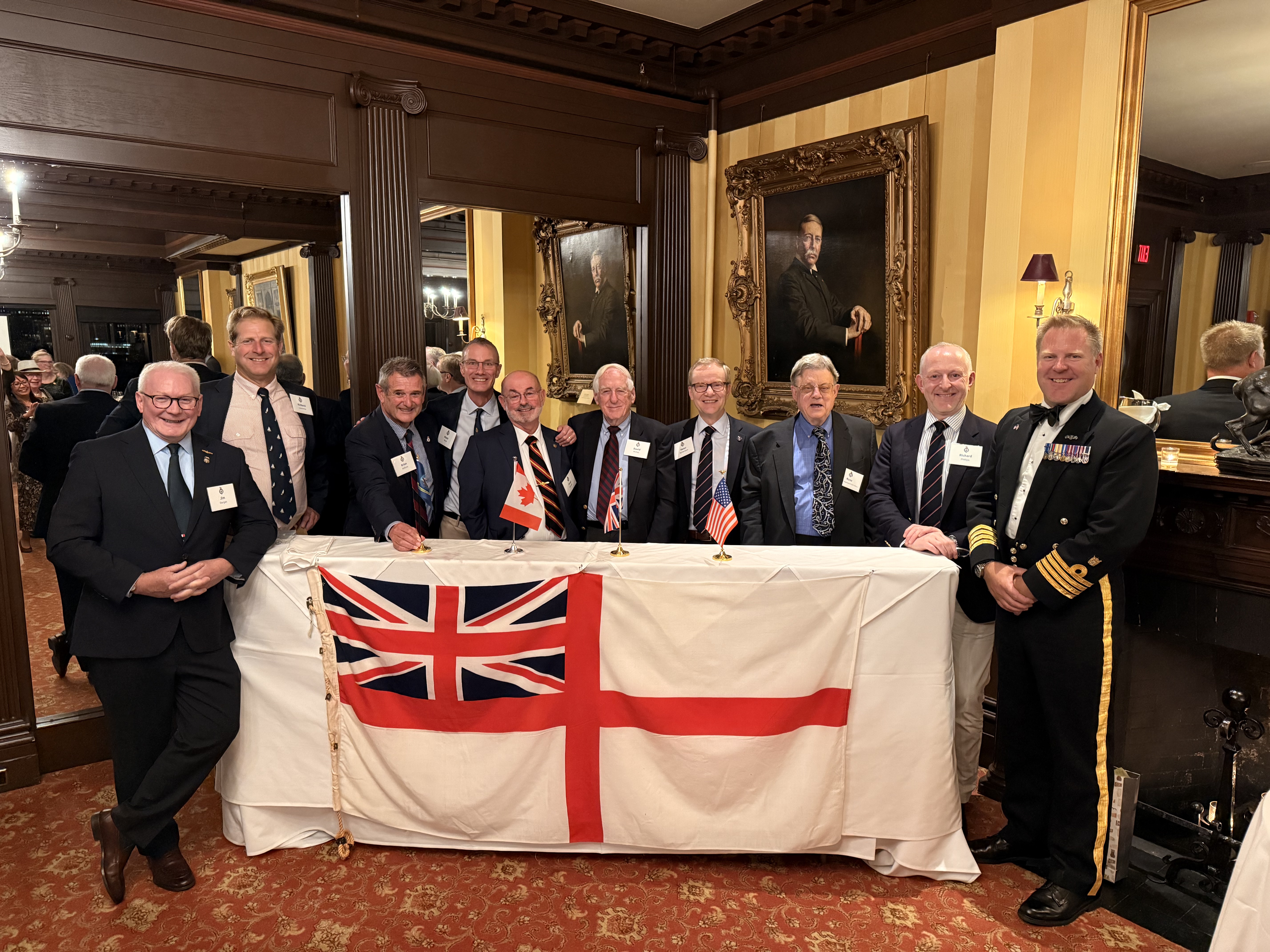 We also took the opportunity to celebrate the United States Navy's 250th Anniversary with the singing of Anchors Aweigh. At the end of the evening, current and former members of the Royal Navy, United States Navy and Royal Canadian Navy gathered behind BOCNE member Jim Dargan's white ensign!