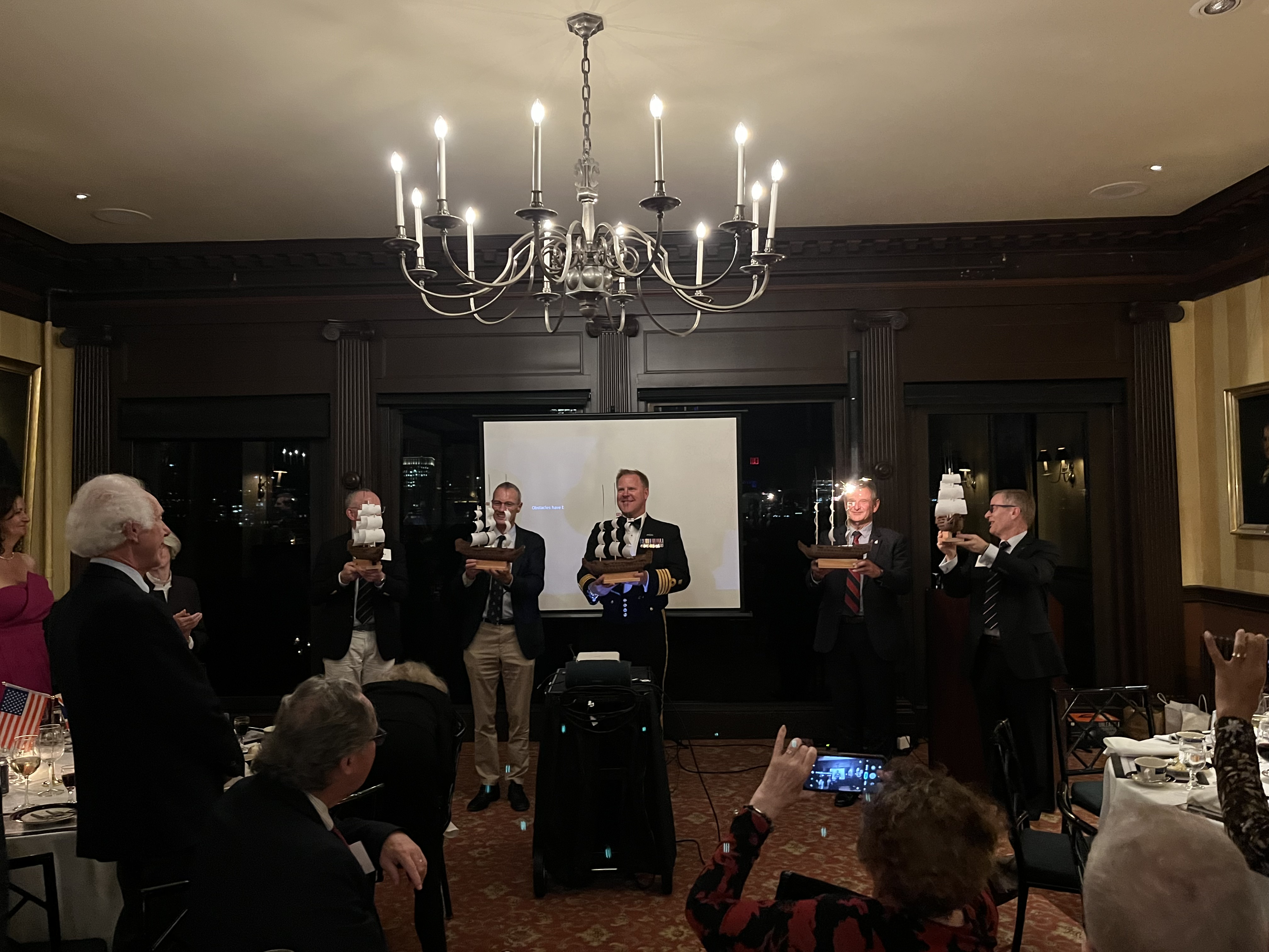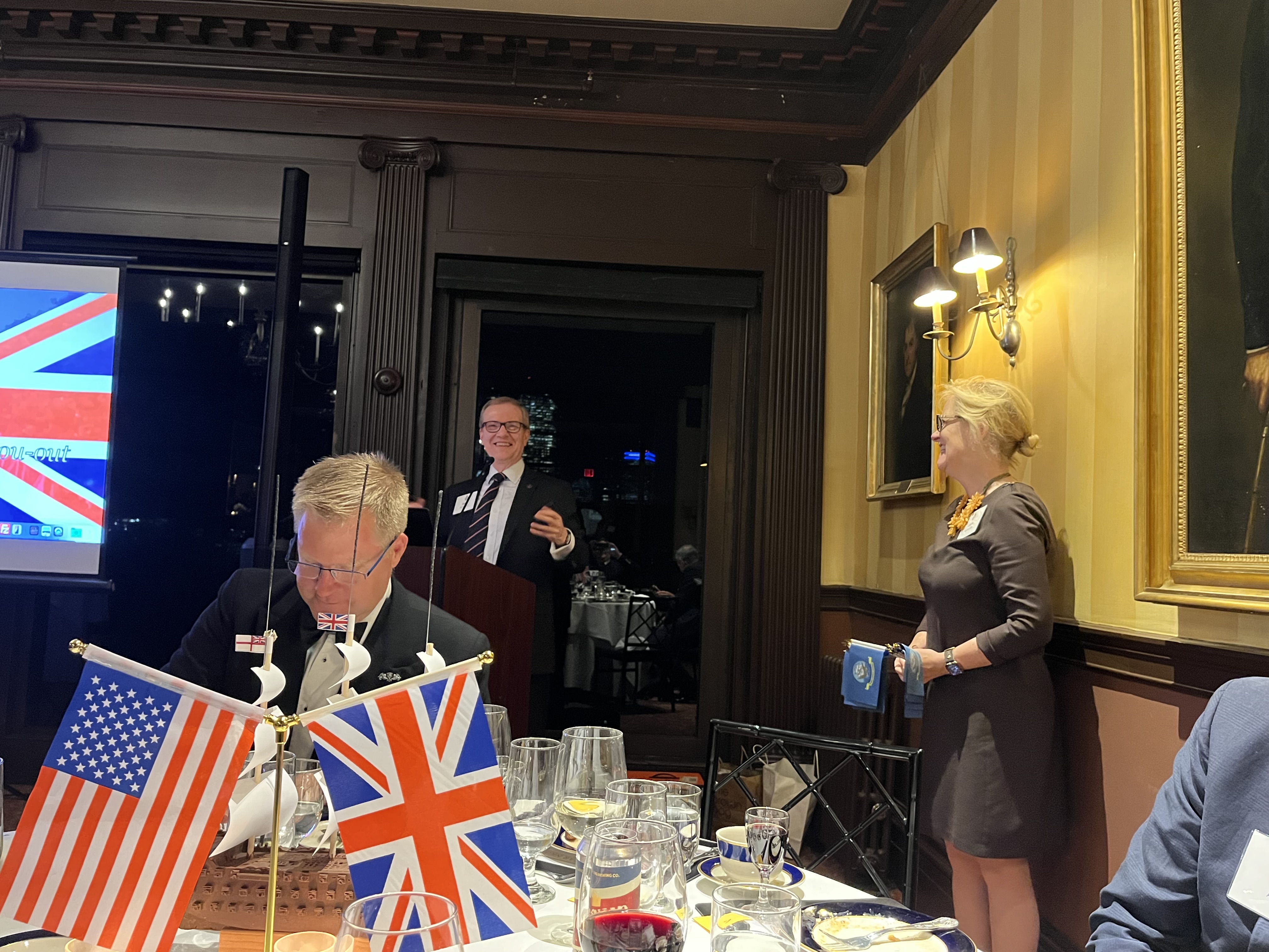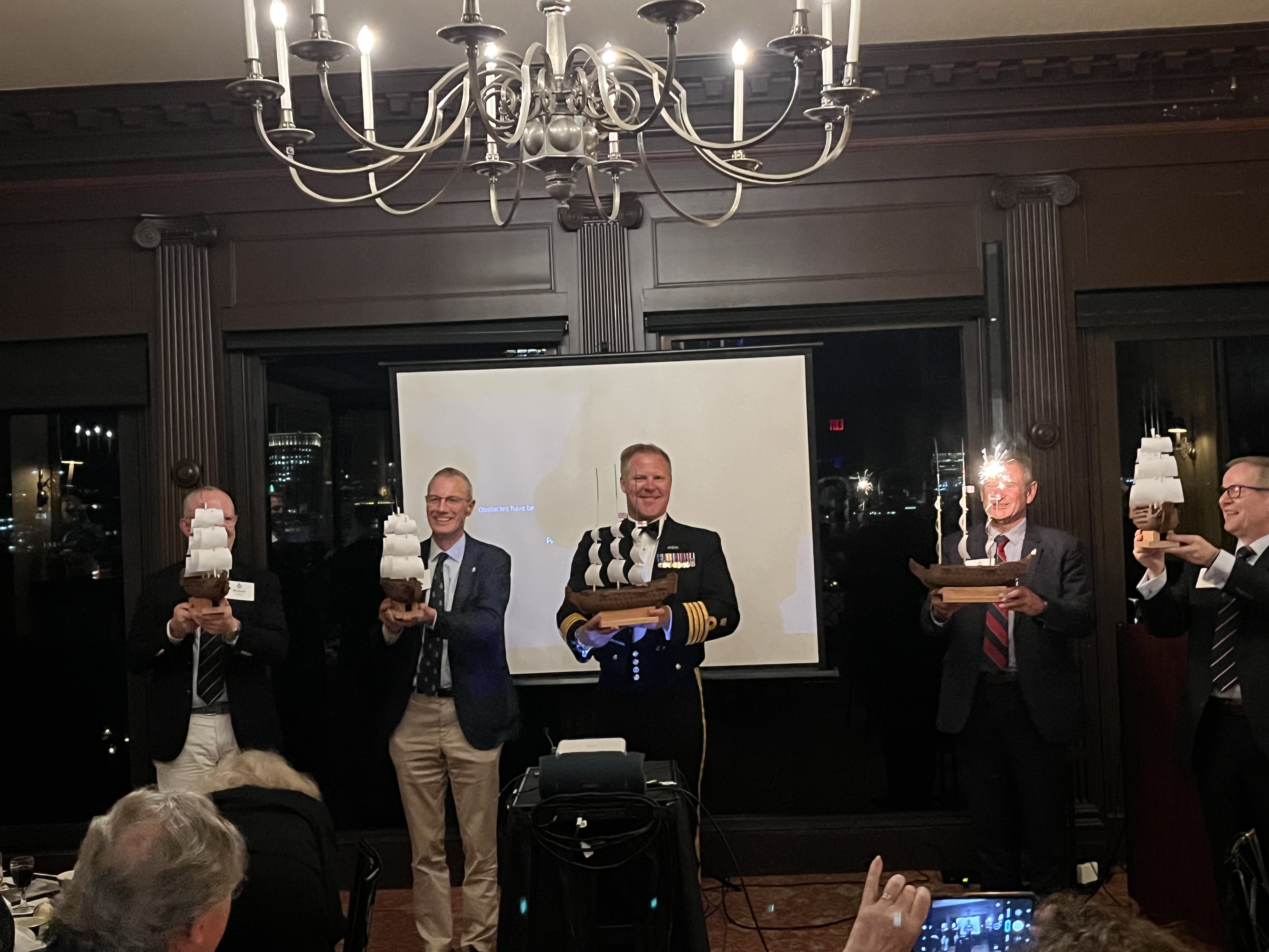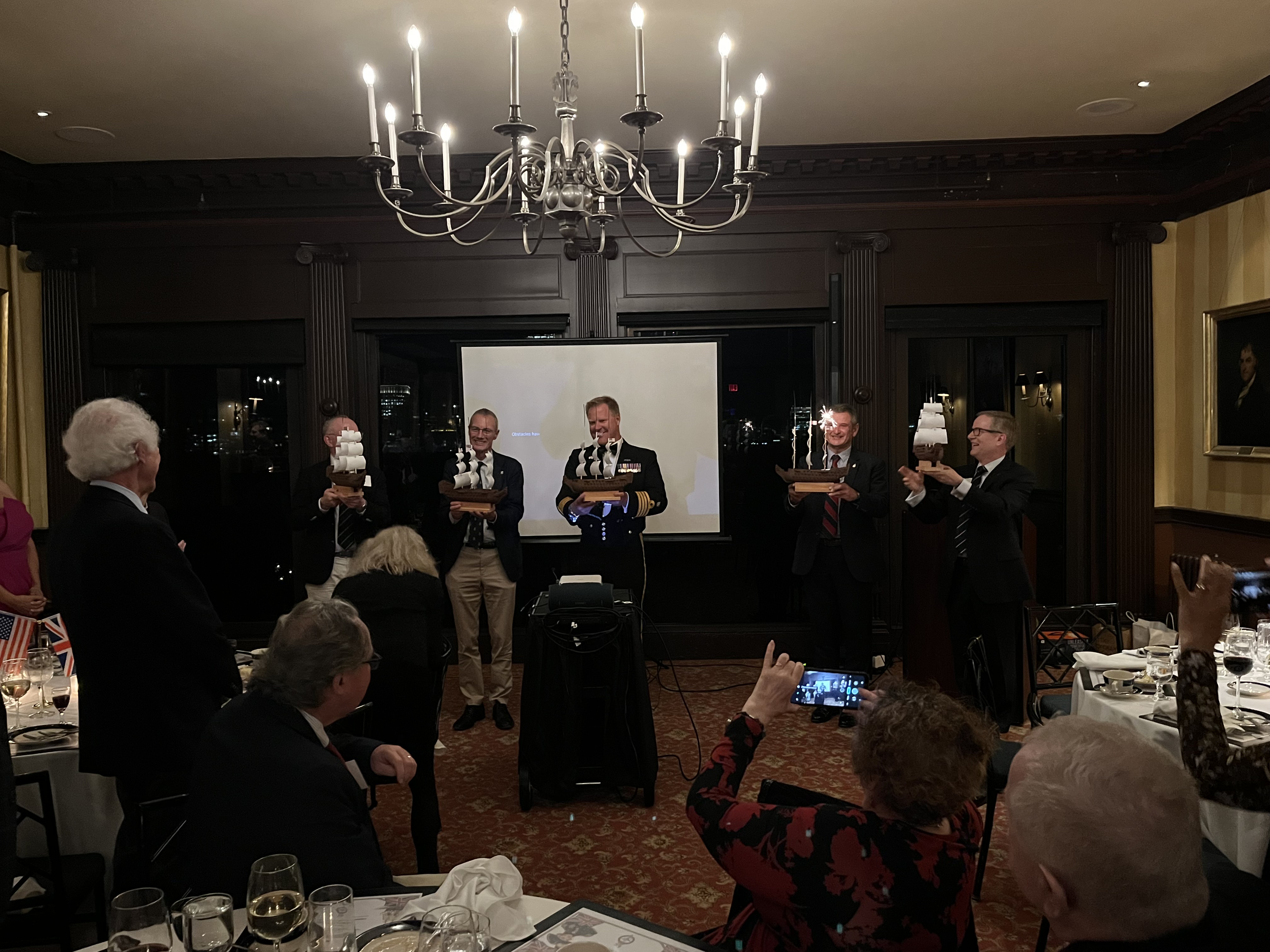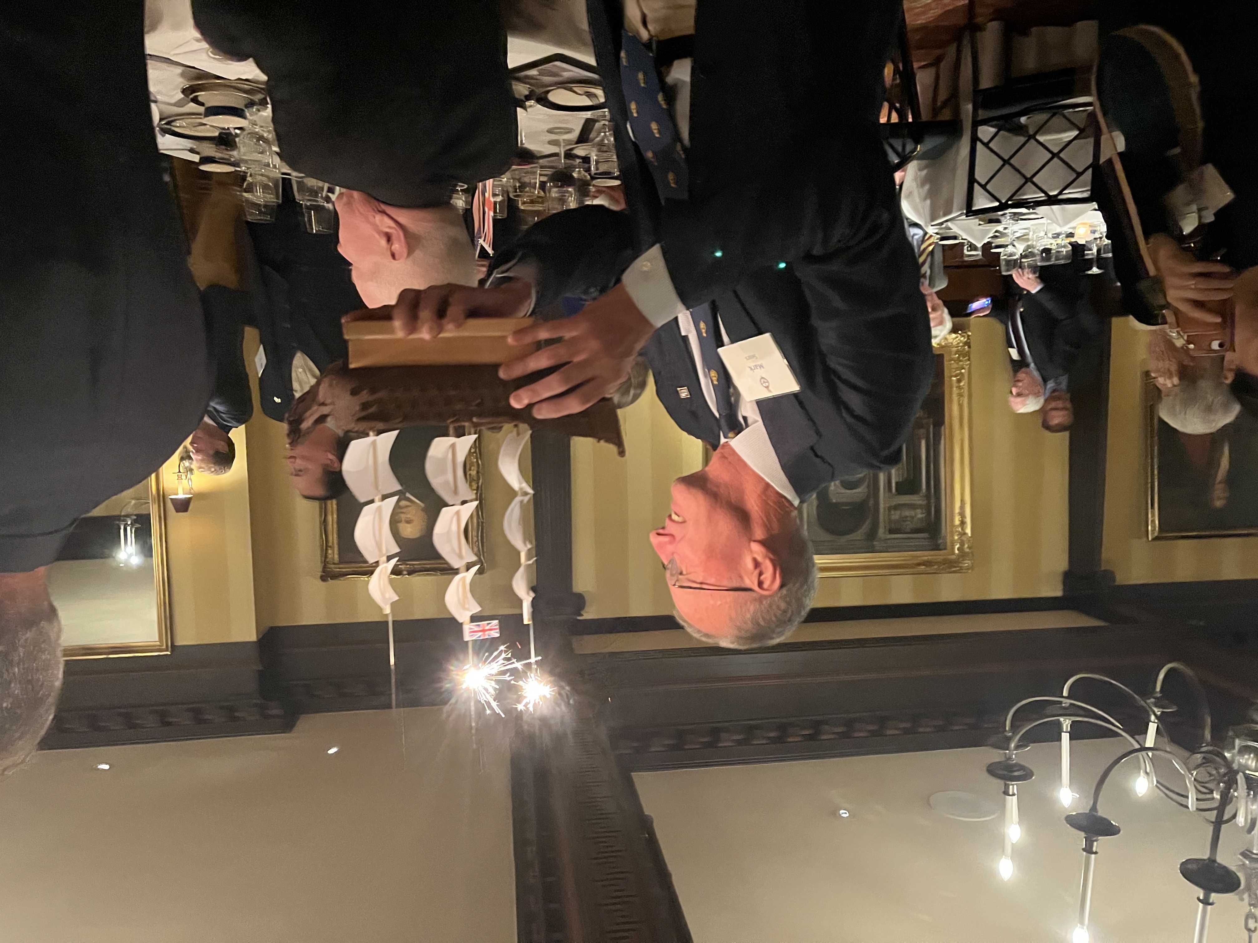 We also took the opportunity to celebrate the United States Navy's 250th Anniversary with the singing of Anchors Aweigh. At the end of the evening, current and former members of the Royal Navy, United States Navy and Royal Canadian Navy gathered behind BOCNE member Jim Dargan's white ensign!