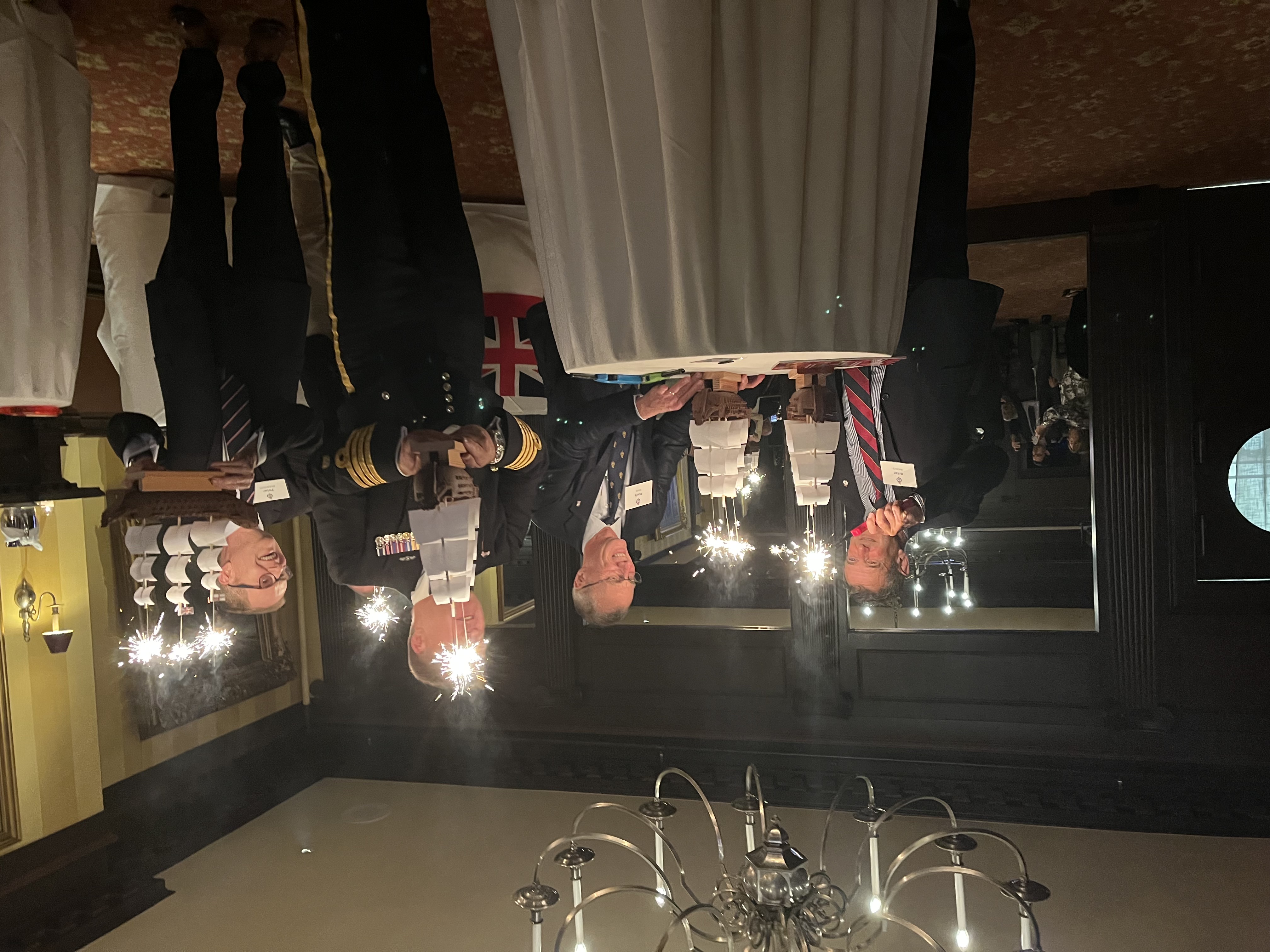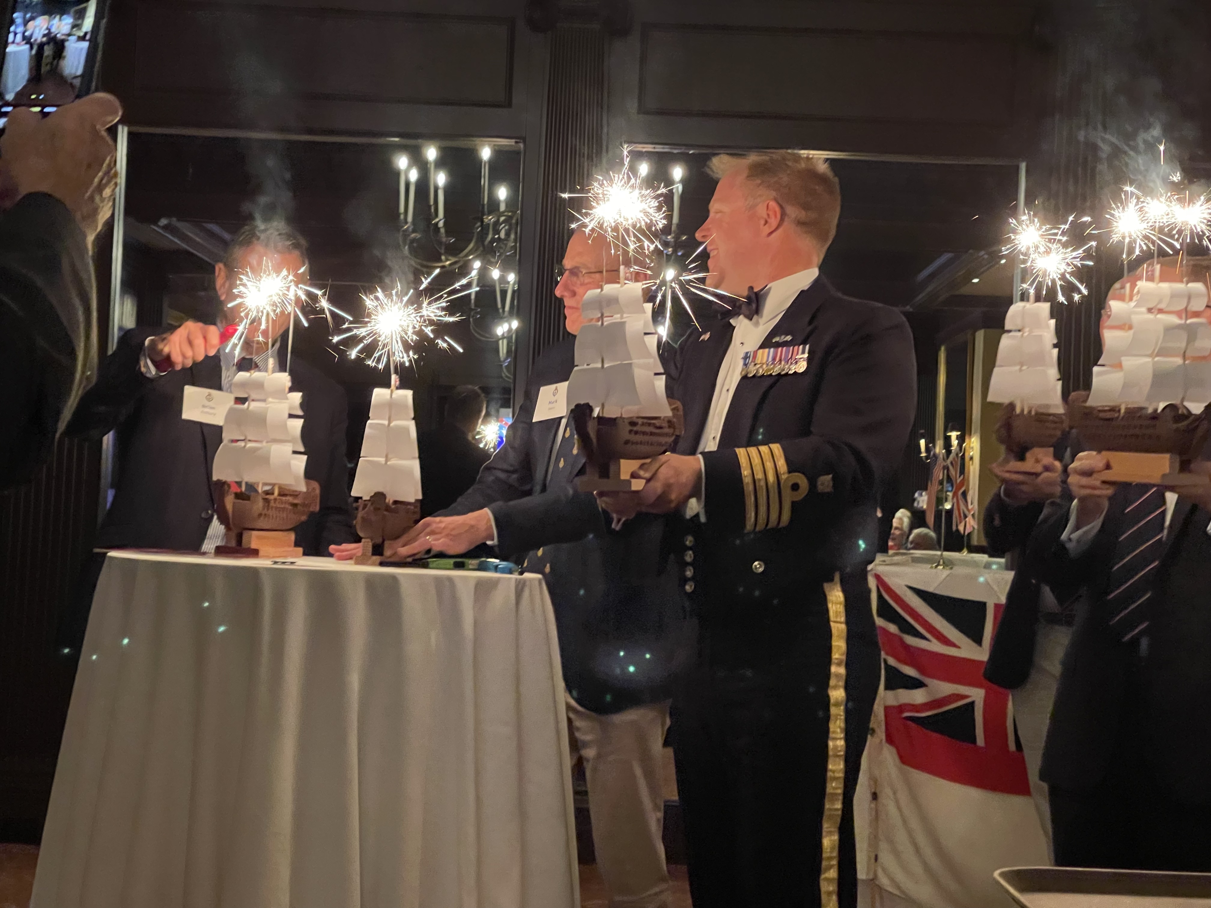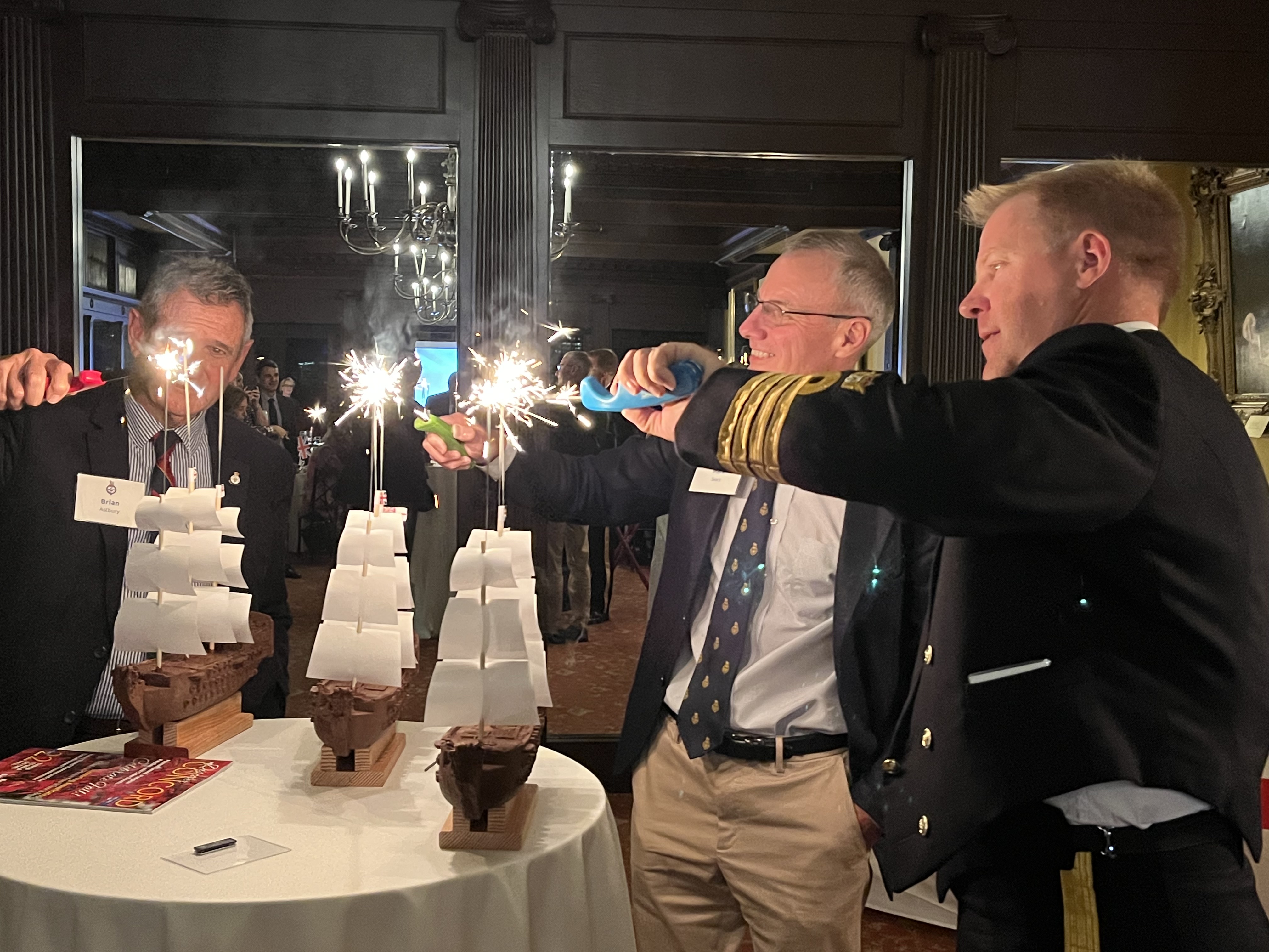 Pictured above, Captain Clark RN is joined by four former Royal Navy Officers as they check their lighters before igniting the sparklers atop the ships' masts.