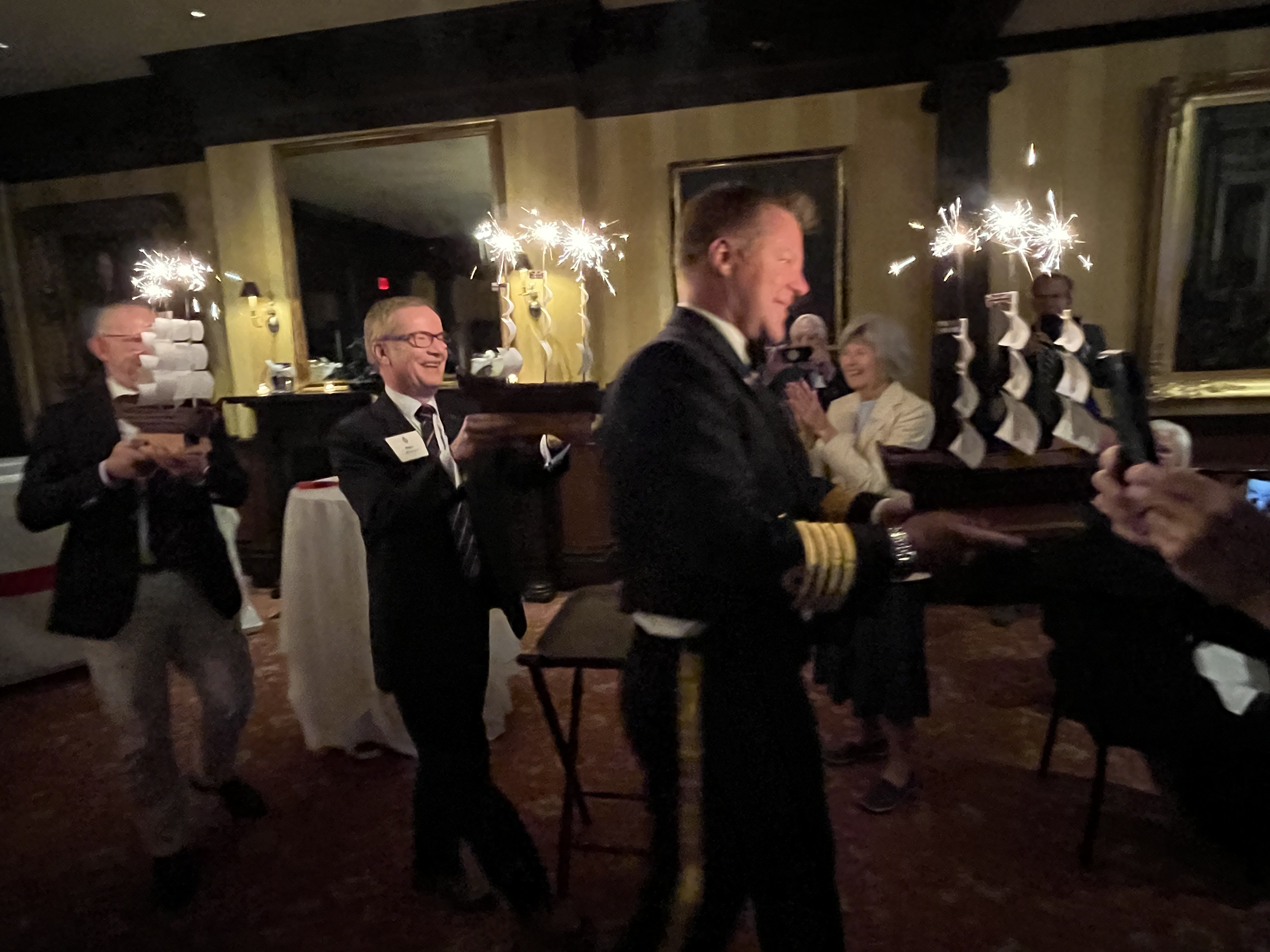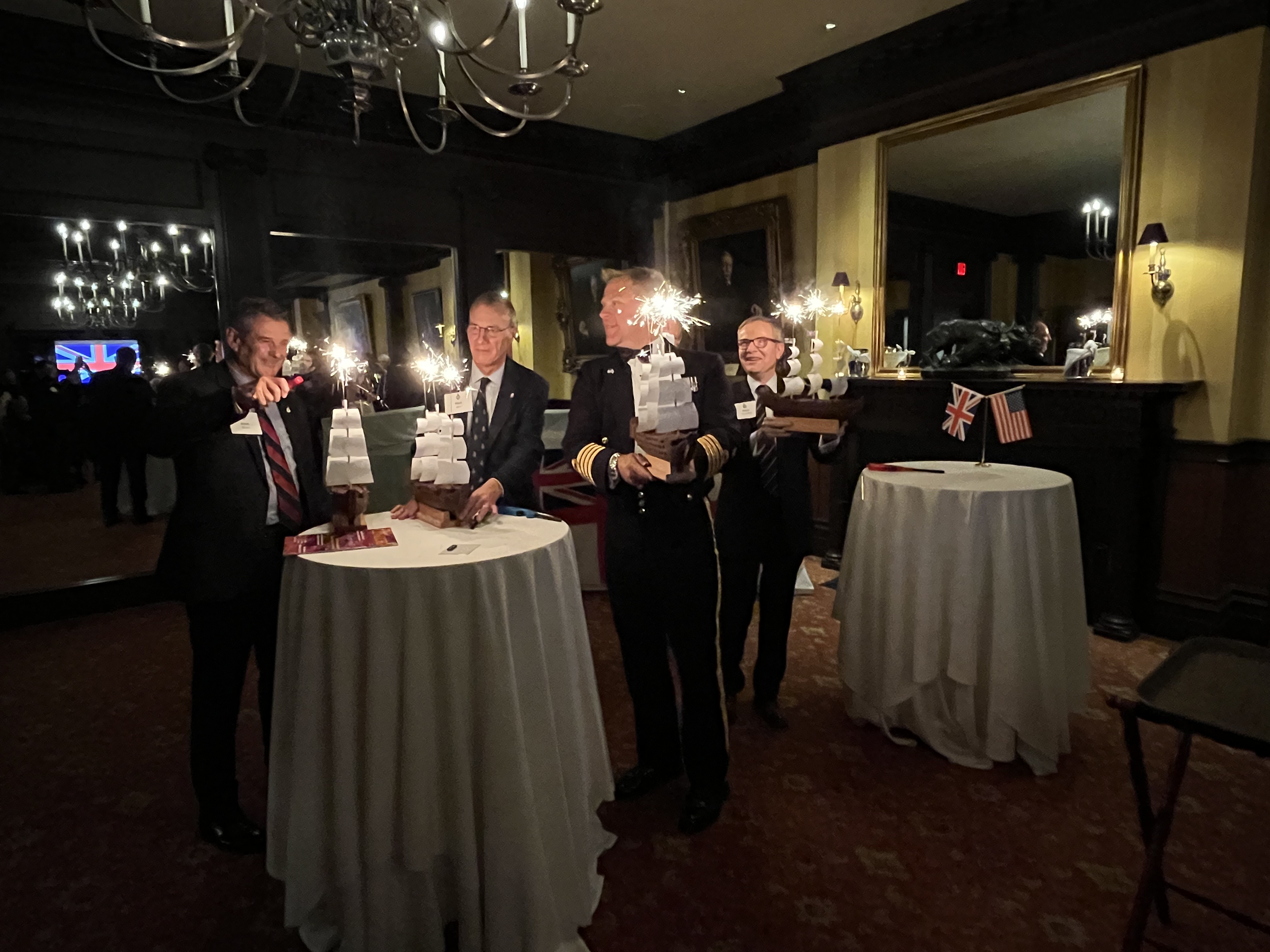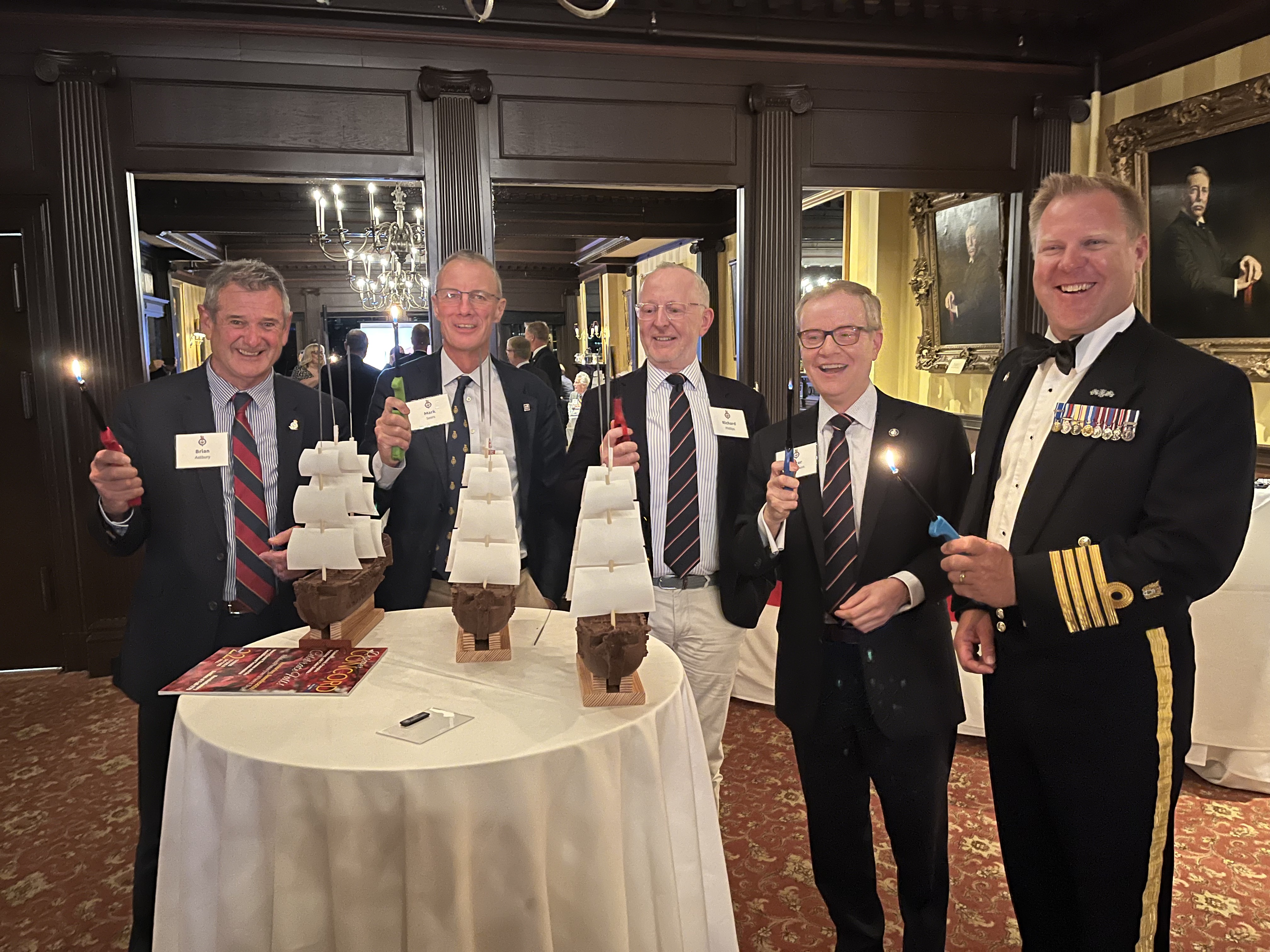 Pictured above, Captain Clark RN is joined by four former Royal Navy Officers as they check their lighters before igniting the sparklers atop the ships' masts.