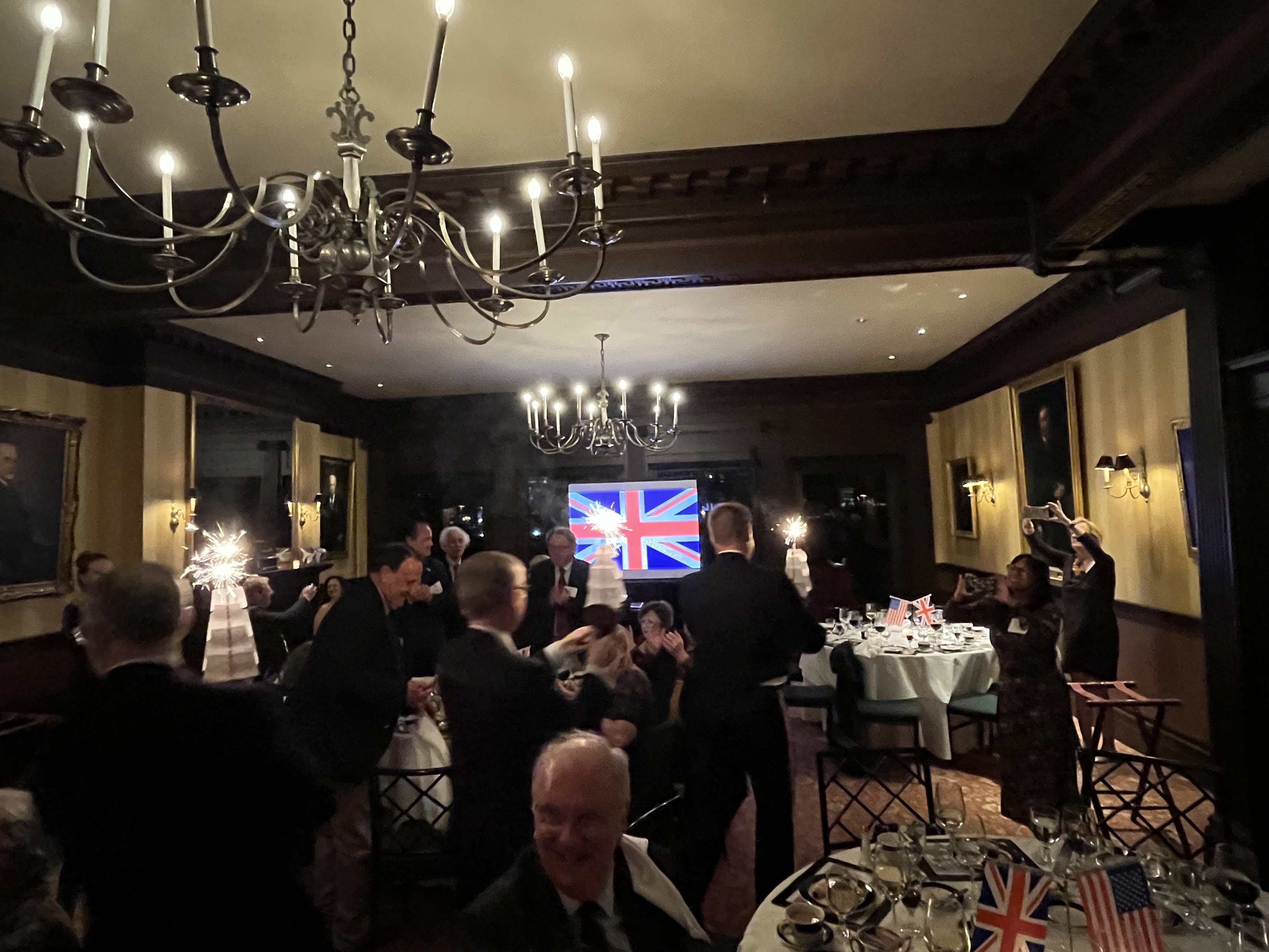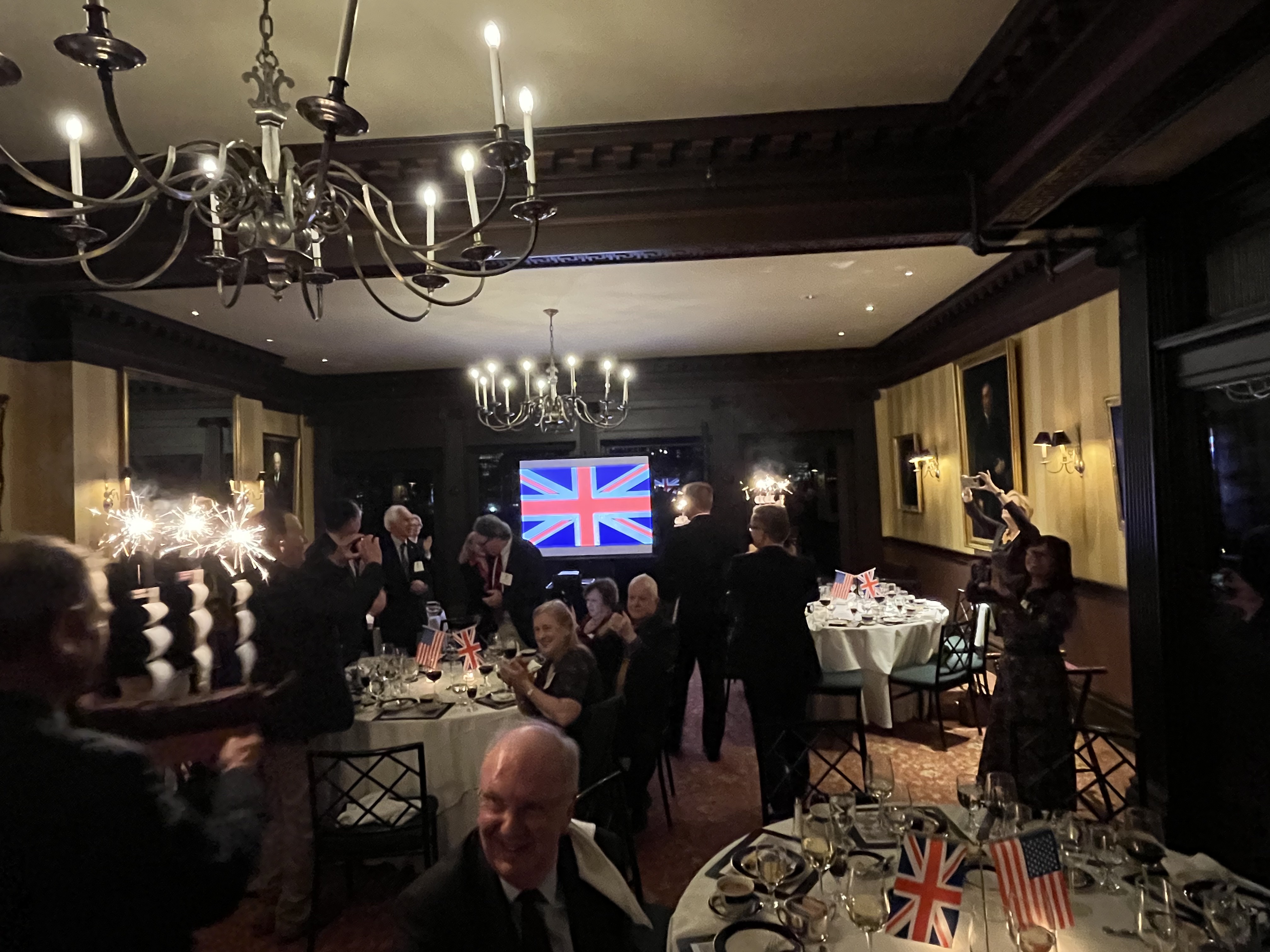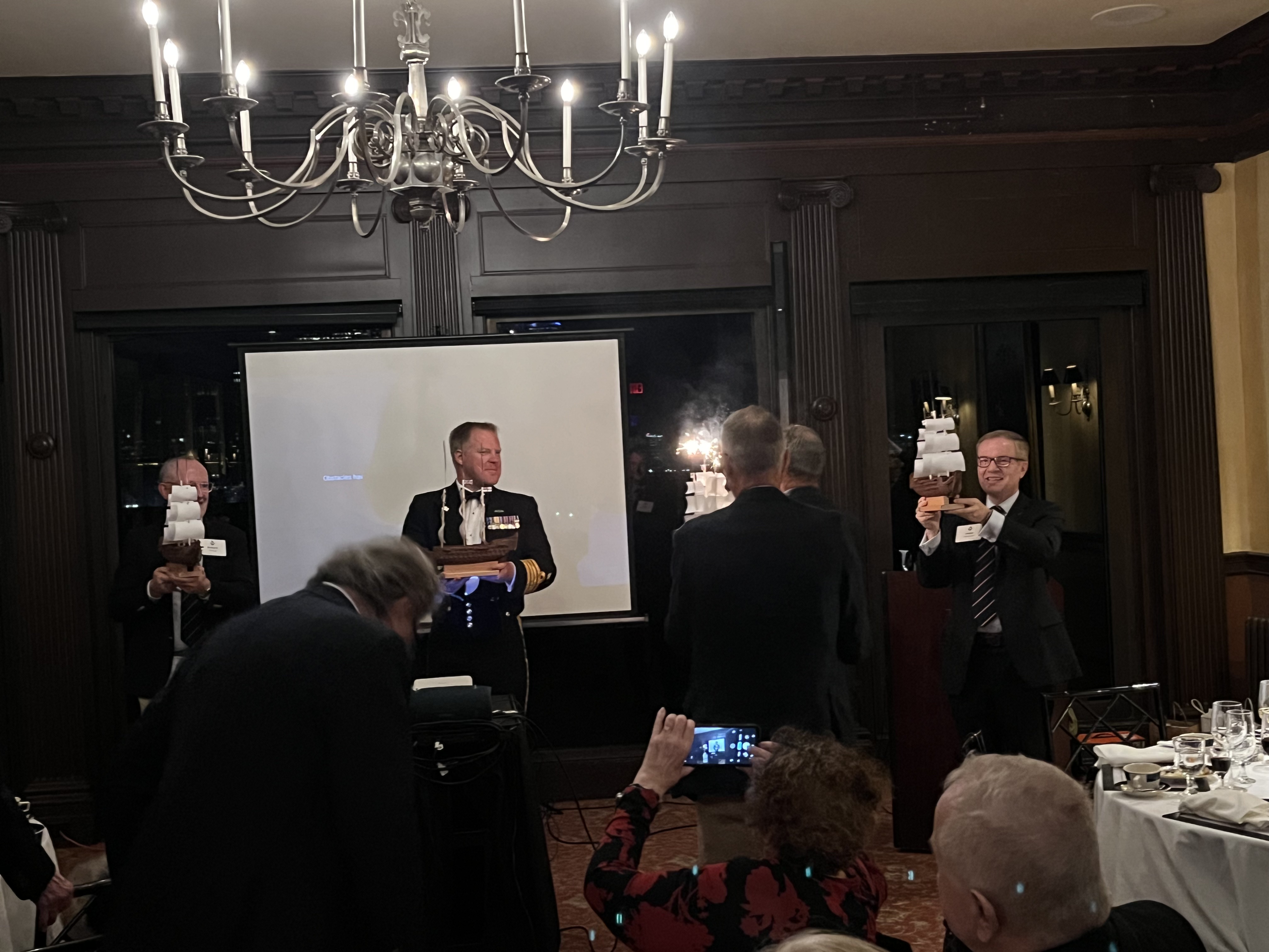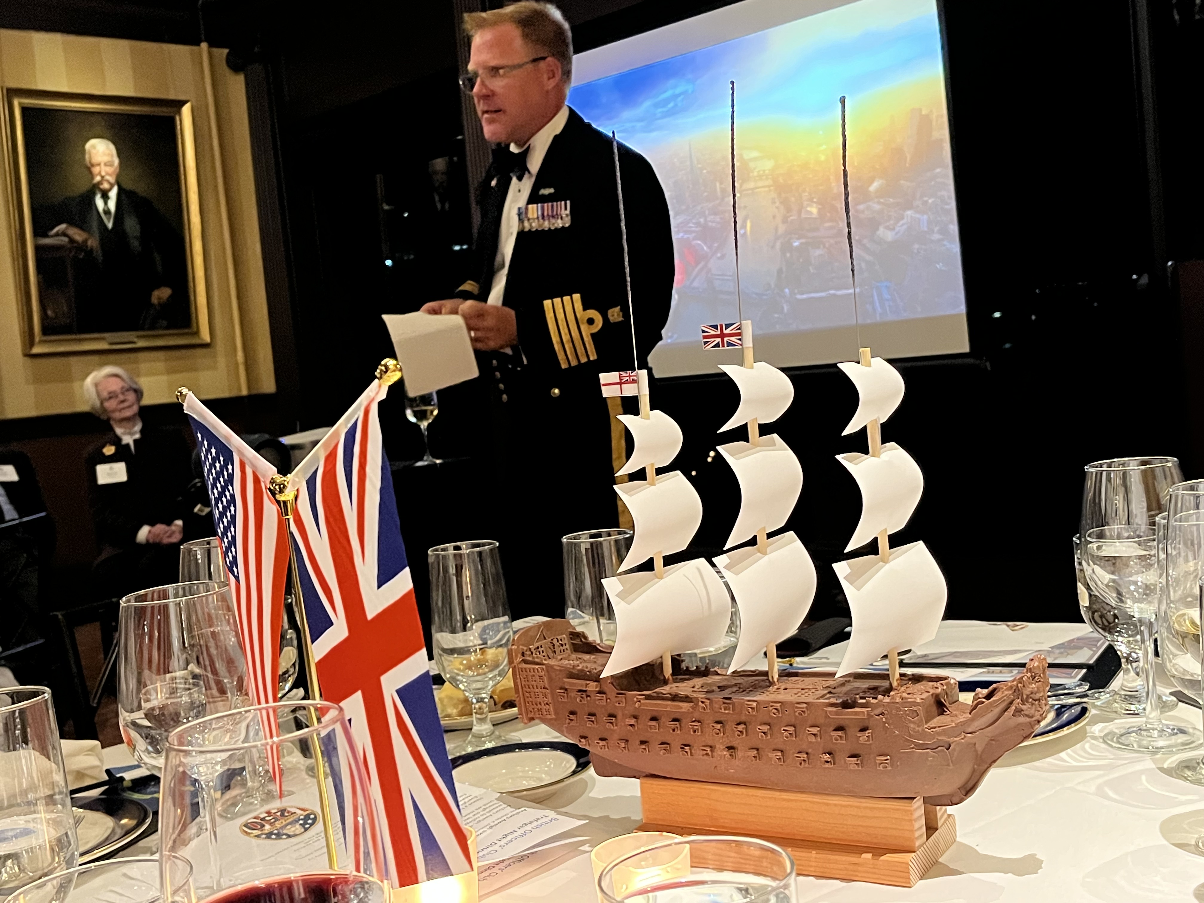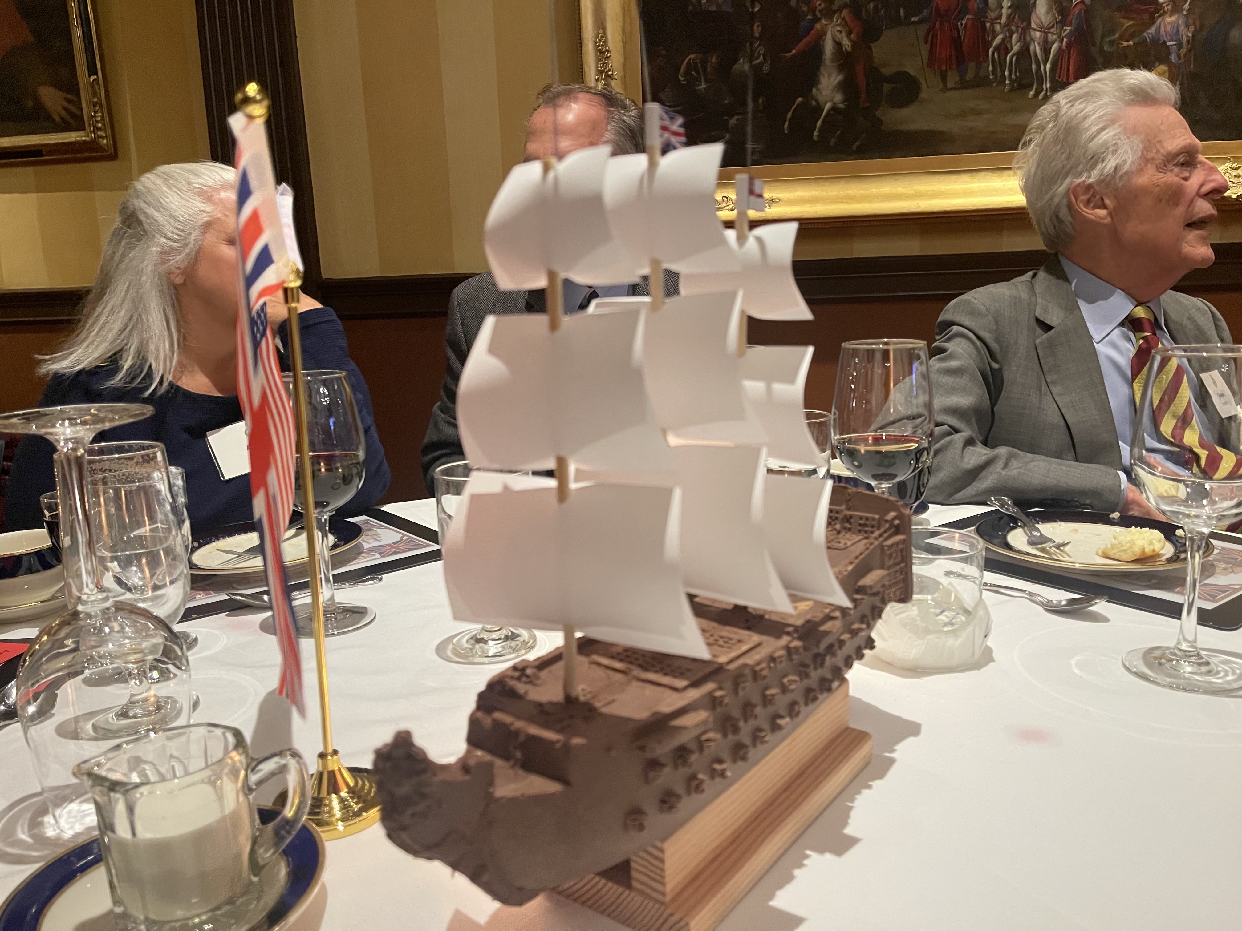 Each table has an HMS Victory centerpiece as our guest of honor commences his after-dinner speech.